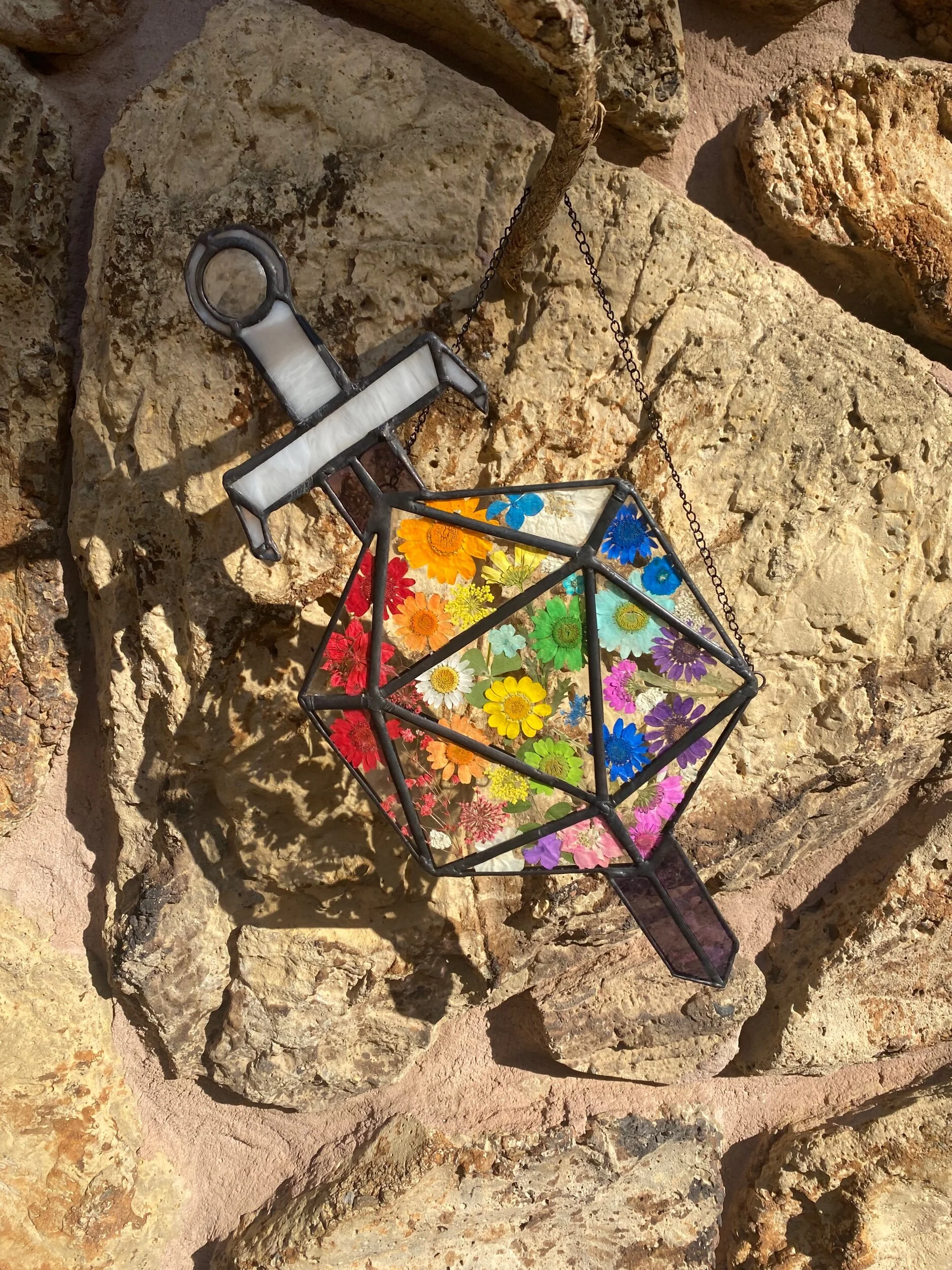 Photos are taken with an iPhone 11 in an attempt to show how the glass looks in direct, natural light. Color may vary slightly depending on your viewing device’s settings. Glass color can vary depending on lighting. This handmade stained glass suncatcher is inspired by popular video games. This product is pre-cleaned and has a protective wax to prolong any oxidation. Each suncatcher comes with a chain for hanging. I recommend using a nail, or very sturdy hanging device. Suction cups not recommended. This product is glass, and the solder used contains lead and is not advised for use by children. Wash hands thoroughly after handling this item and before eating and drinking. Oxidation (white gunk) is normal on lead solder over time. Please refer to cleaning instructions. Pattern credit can be found in additional info.